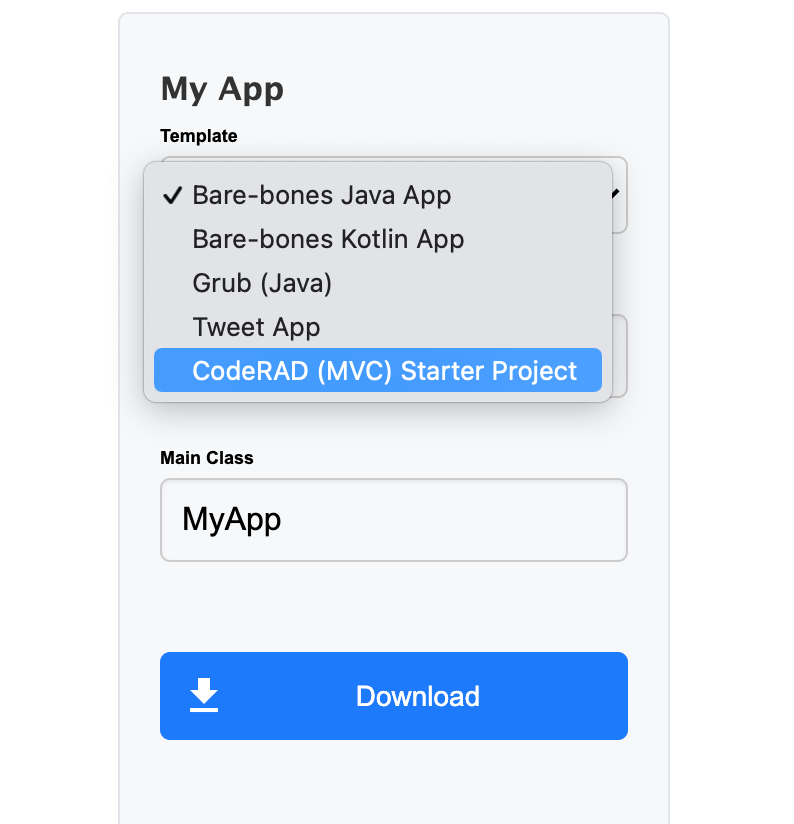 We have added a “CodeRAD (MVC) Starter Project” option to the Codename One initializr, which will give you a starting point for developing apps with CodeRAD 2.